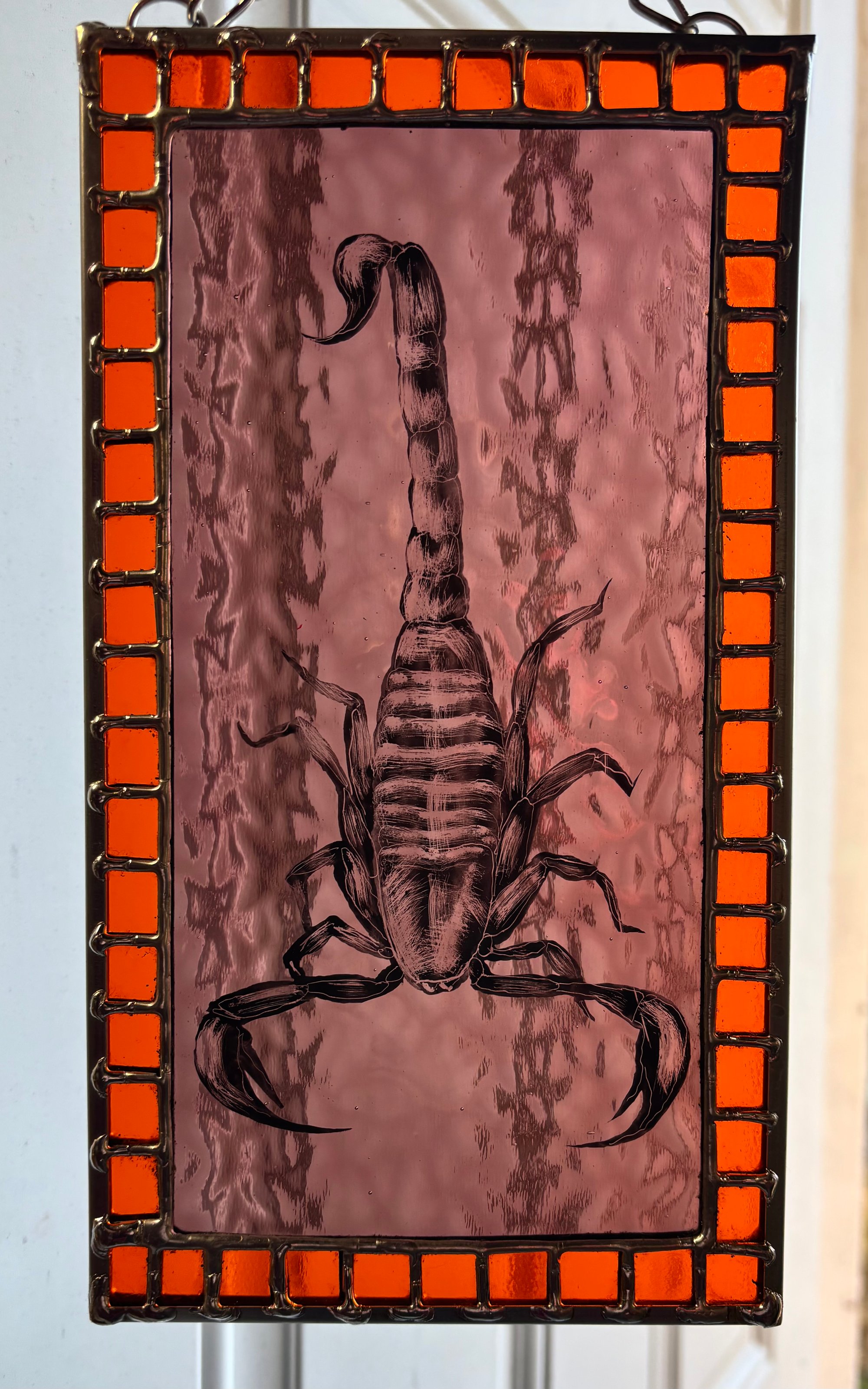 Hand painted scorpion on textured transparent purple glass with bright transparent orange border